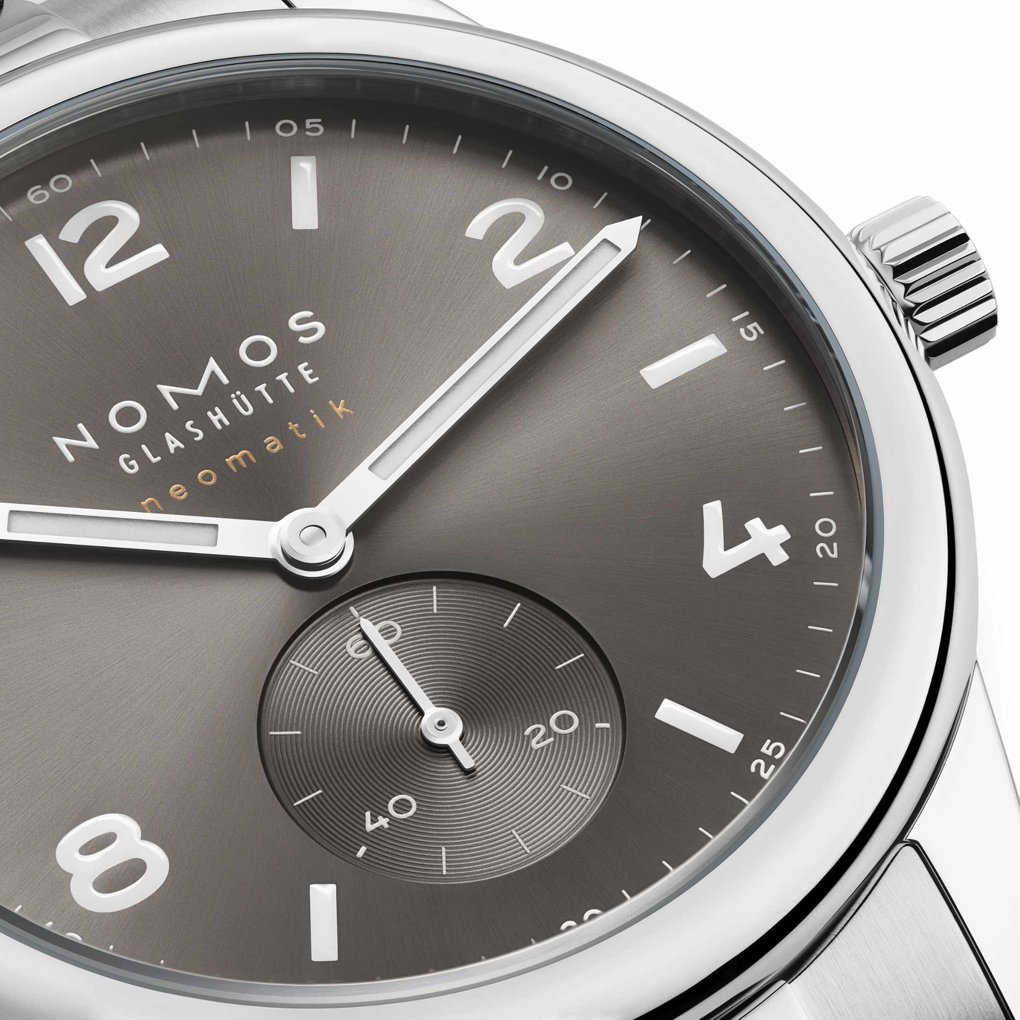 Ref. 764 - Der Strahlenschliff des galvanisierten Zifferblatts lässt das rauchige Hellgrau reich und charakterstark leuchten. Die sportliche NOMOS-Automatikuhr repräsentiert Stil und Kennerschaft. Sie verleiht Glanz, ohne aufzutragen. Im robusten Edelstahlgehäuse mit einem polierten wie satinierten Gliederarmband aus Edelstahl ist Club Sport neomatik 39 smoke wasserdicht bis 20 atm und mit einer Höhe von 8,5 Millimetern zugleich ungewöhnlich flach. Im Inneren arbeitet das manufakturgefertigte Automatikkaliber DUW 3001 mit hauseigenem Assortiment NOMOS-Swing-System.