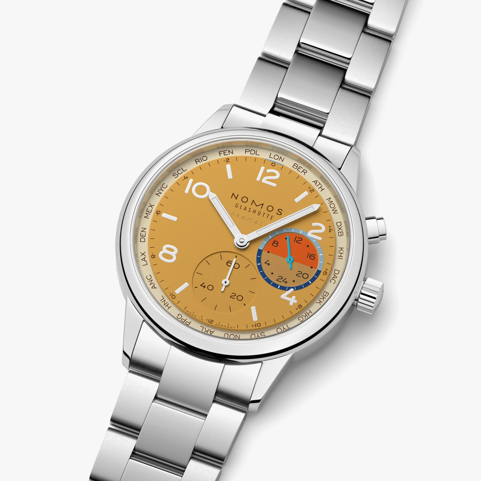 Ref. 790.S6 - Wenn Resilienz eine Farbe hätte, wäre das goldene Wüstenbeige dieser Uhr perfekt. Es symbolisiert Unerschöpflichkeit – von Ruhe, Kraft und Wandel. Wie eine Fata Morgana umrahmen im Zifferblatt dieser Uhr zwei Halbkreise in kühlen Blautönen warmes Sonnenuntergangsorange. Die Weltzeituhr mit Automatikkaliber ist so sportlich wie elegant. Sie macht die 24 Zeitzonen auf einen Blick erfassbar und hat eine 24-Stunden-Anzeige für eine zweite Zeitzone. Dune ist auf 175 Exemplare limitiert – eine exklusive und sehr persönliche Verbindung mit der Welt.